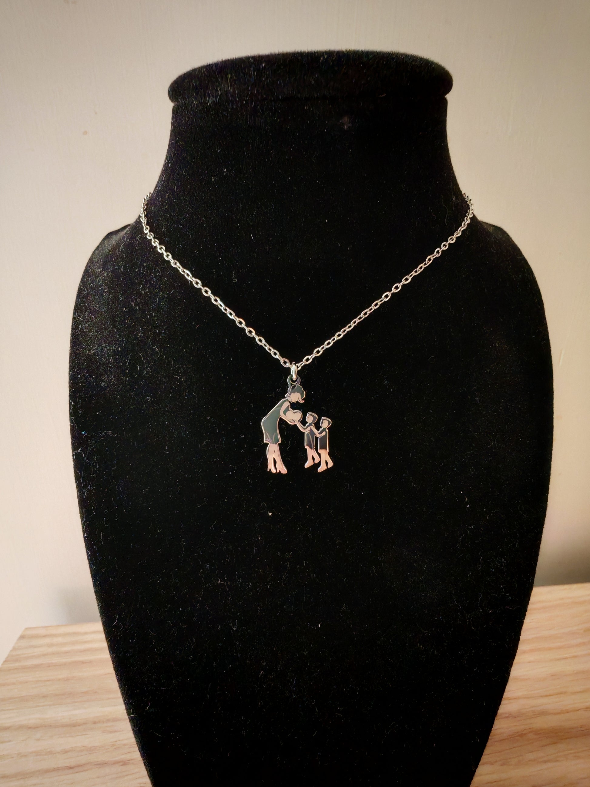 La collana Mamma e figli è realizzata in acciaio inossidabile, un materiale resistente e di alta qualità. Il ciondolo rappresenta una mamma e i suoi due figli maschi, un simbolo di amore e unità familiare. Disponibile nella colorazione argento, perfetta per aggiungere un tocco di eleganza ad ogni outfit.