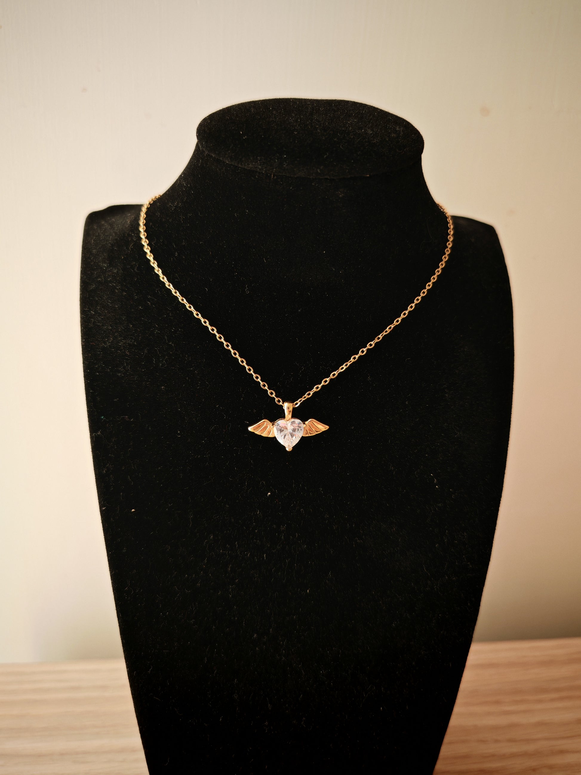 Questa collana in acciaio inossidabile nella colorazione oro è adornata da un pendente a forma di cuore cubic zirconia con ali. Il materiale resistente e la bellezza dei dettagli rendono questa collana un'aggiunta elegante e duratura al tuo guardaroba.