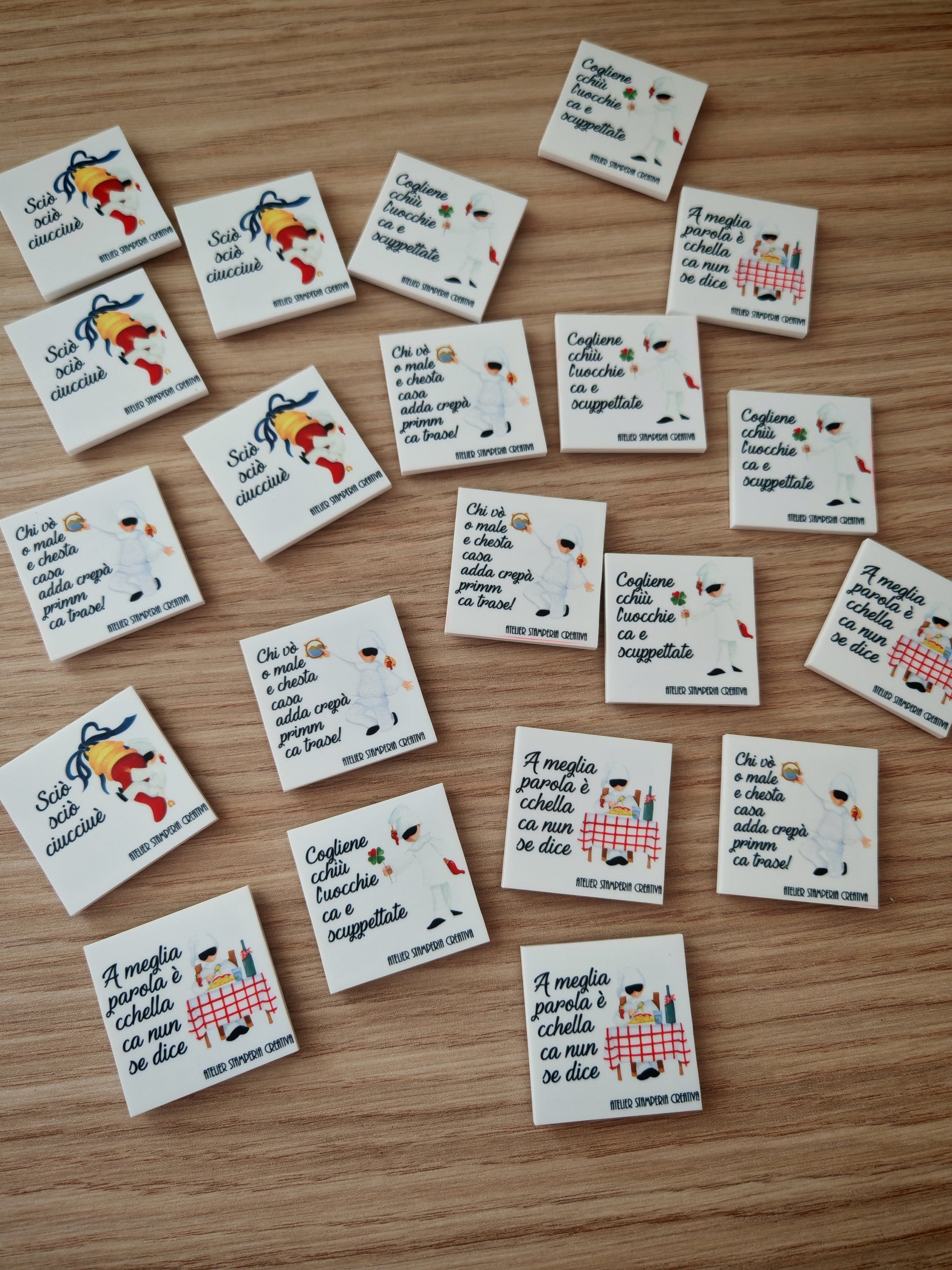 Questi magneti sono la perfetta piccola bomboniera o segnaposto per il tuo evento. Con stampa di frasi tipiche napoletane, sono divertenti e di effetto. Disponibili in lotti da 10 pezzi con diverse grafiche miste. Aggiungi un tocco di tradizione al tuo evento con questi magnifici magneti.