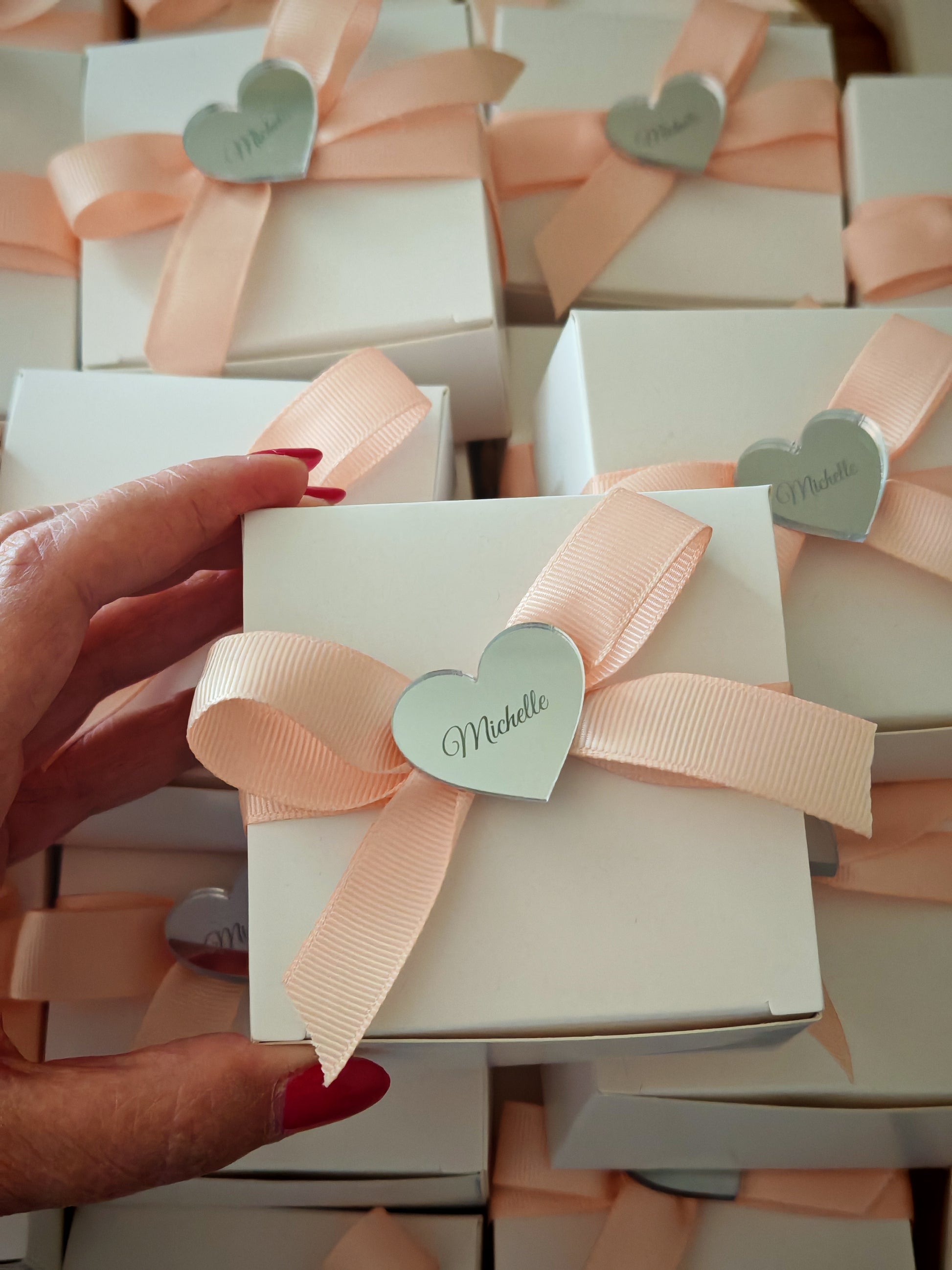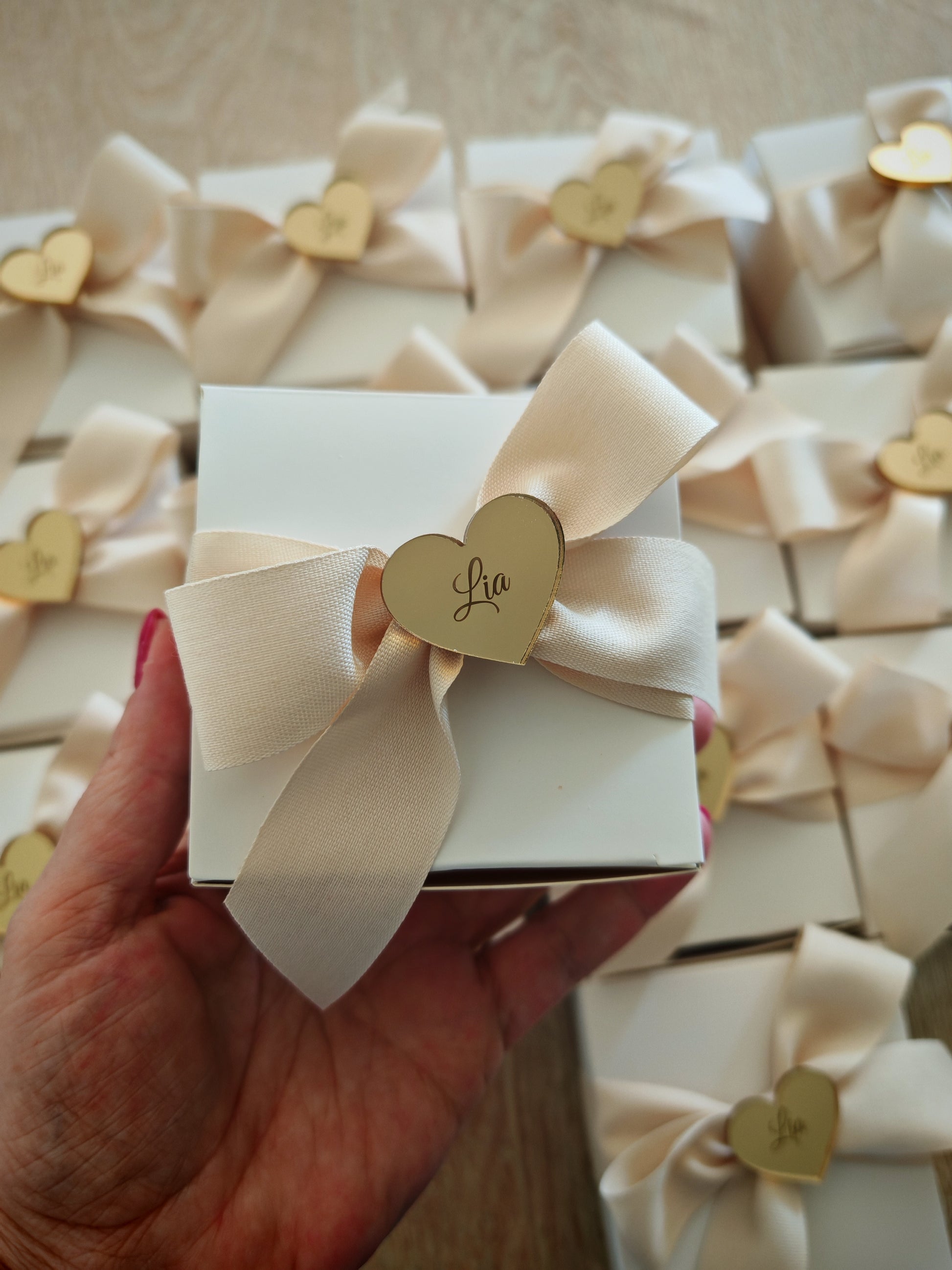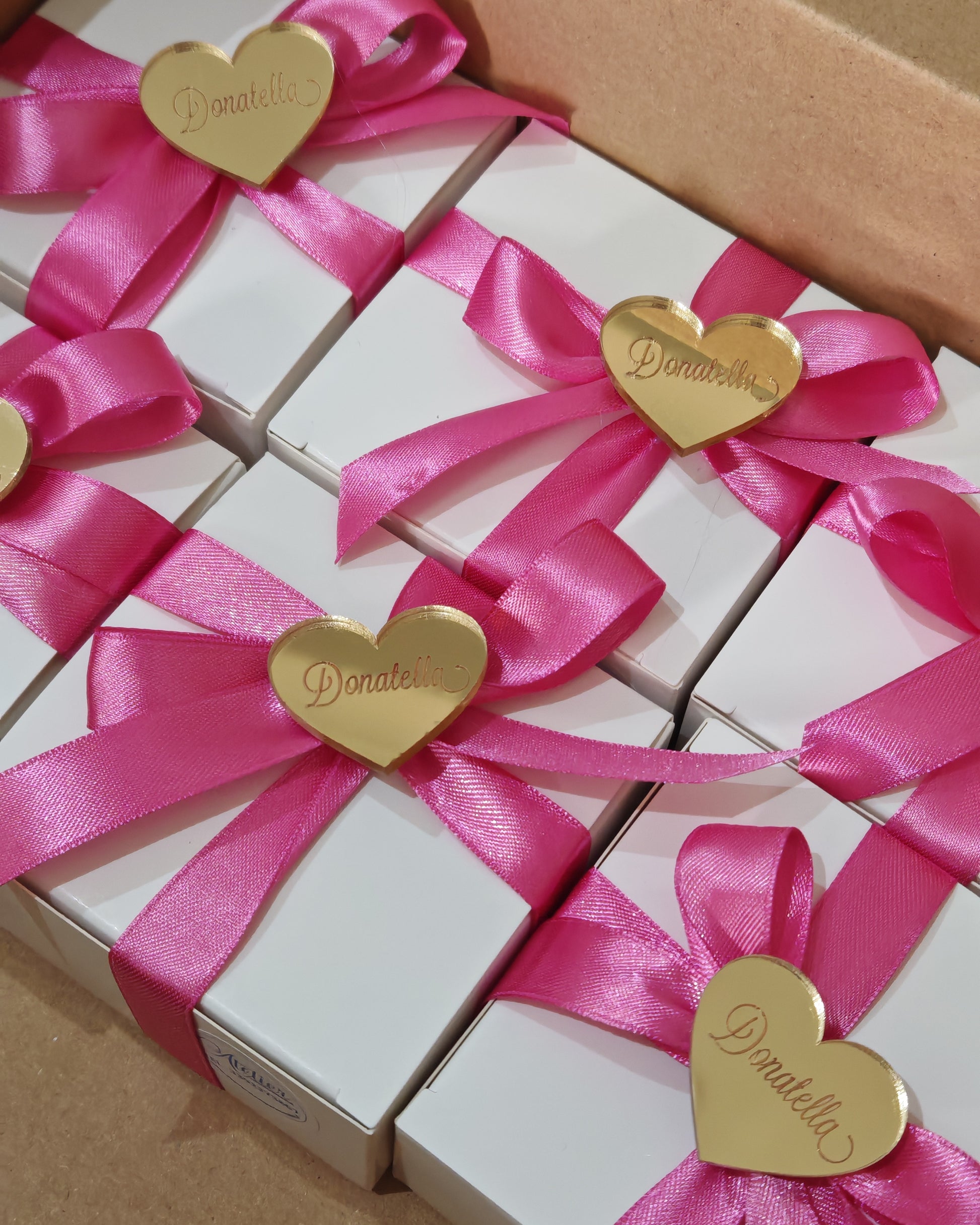 Confezionati in scatola , con nastro colore a scelta , confetti , biglietto evento e tag a cuore in plexiglass con incisione personalizzata.