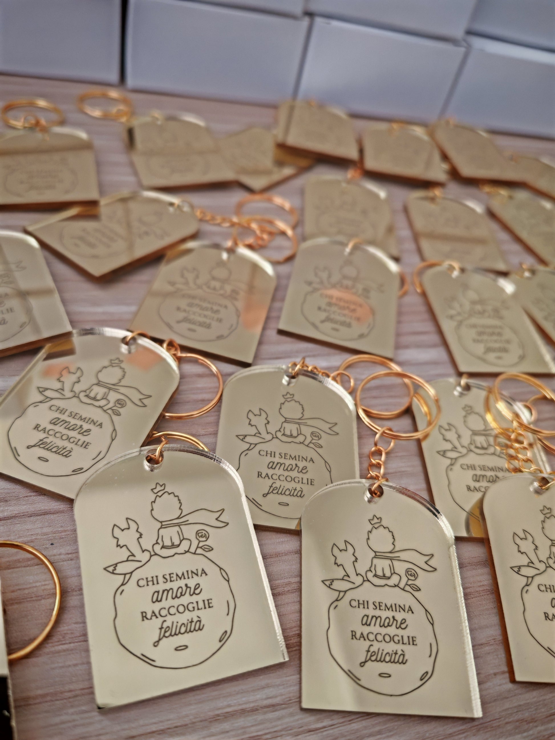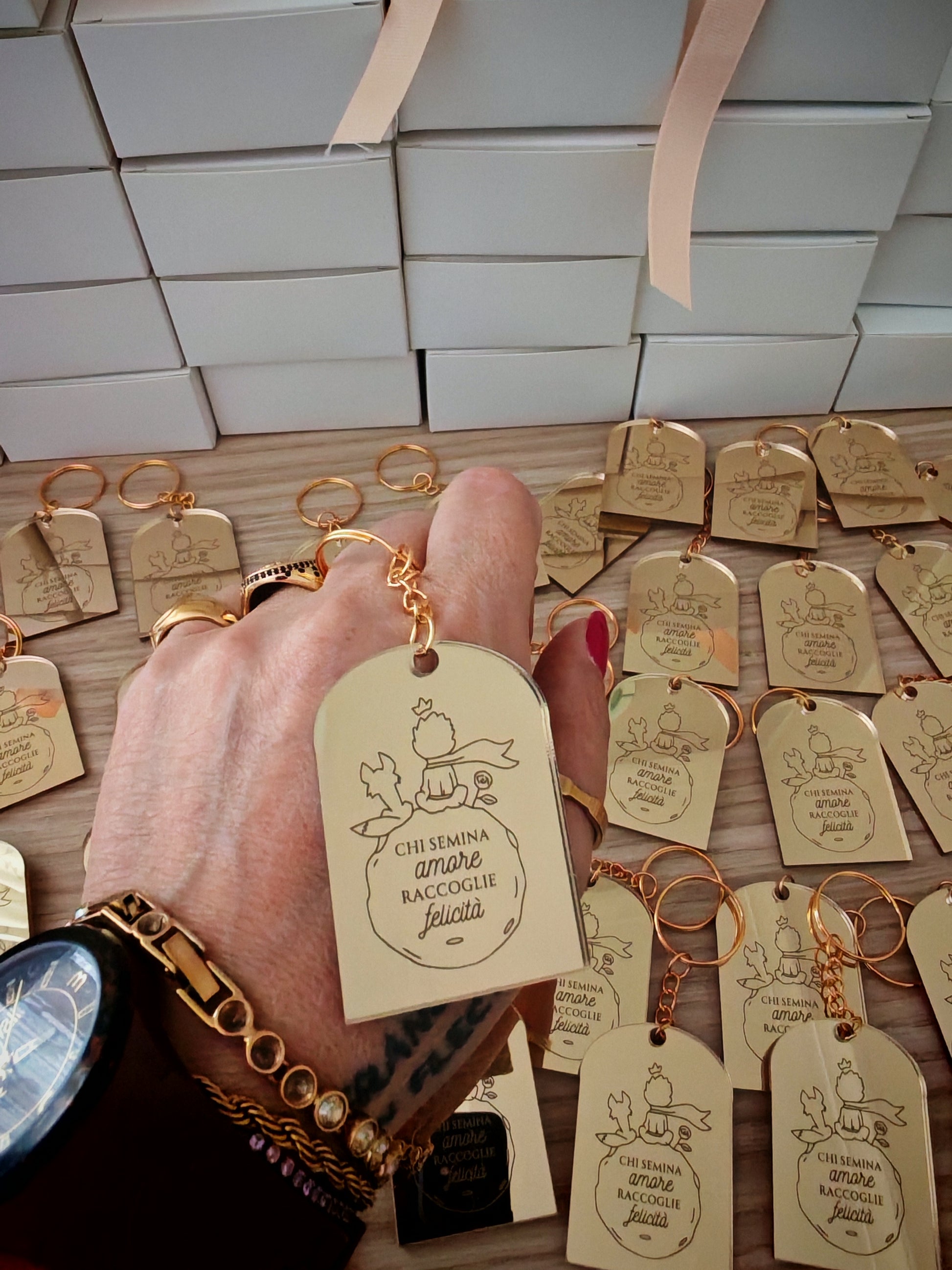 Un bellissimo portachiavi in plexiglass con l'incisione "Piccolo Principe". Perfetto come bomboniera o segnaposto per una celebrazione speciale. Porta sempre con te il tuo simpatico compagno di viaggio grazie a questo portachiavi unico e originale.